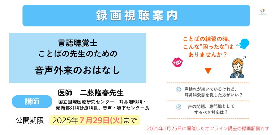 言語聴覚士(ST)向け講座『言語聴覚士・ことばの教室の先生のための 音声外来のおはなし』の録画配信を開始(公開期限2025/7/29)
