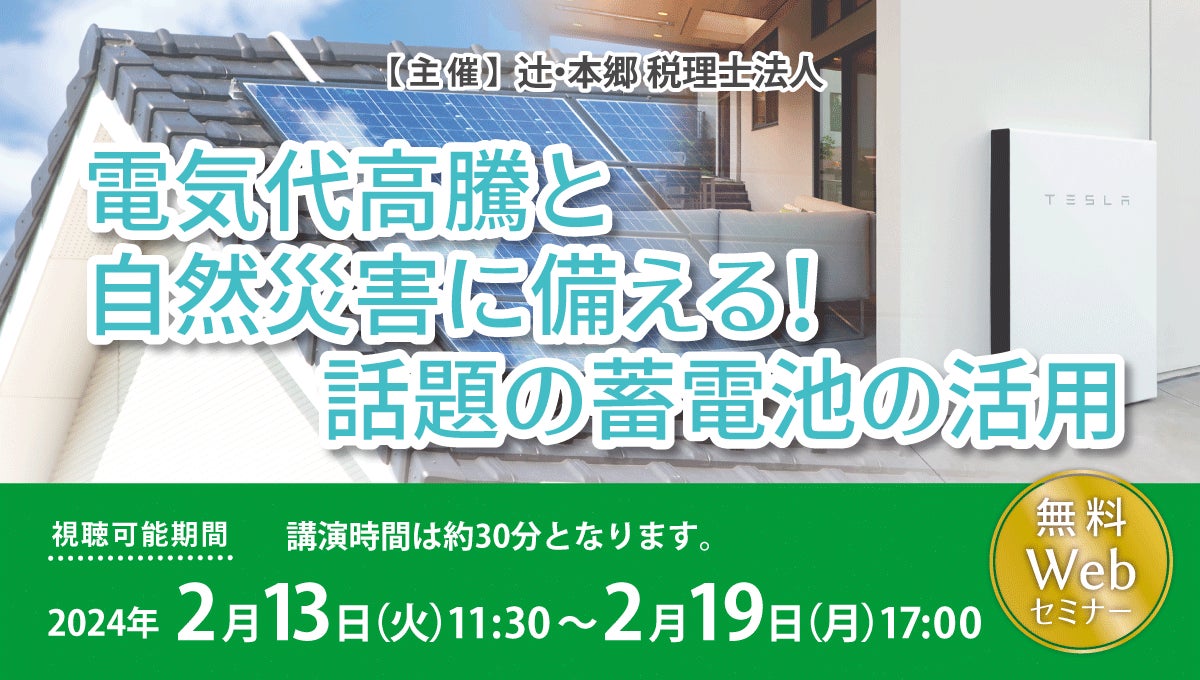 辻・本郷 税理士法人(本社:東京都新宿区、理事長:徳田孝司)は2024年2月13日(火)より「電気代高騰と自然災害に備える! 話題の蓄電池の活用」セミナーを開催いたします。電気代高騰が深刻化する中、クリーンエネルギーでもある太陽光発電と蓄電池に注目が集まっています。これらは、日中に消費しきれない電力を蓄電し夜に放電することで省エネ・節電を実現し、災害時の停電の備えとしての活用も見込めます。本セミナーでは、太陽光発電と蓄電池のメリット・デメリットについて、個人宅・法人建物の事例を交えて詳しく解説いたします。また、TESLA社製の蓄電池についてもご案内いたします。