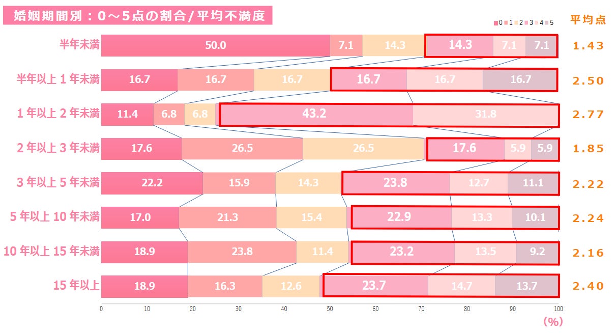 婚姻期間別では、「結婚1年以上2年未満」の不満度が最も高く、新婚期の「理想とのギャップ不満」が浮き彫りに。また、「15年以上」のベテラン夫婦でも不満3点以上が52.1%となり、「夫婦の総決算期」の課題が浮上。