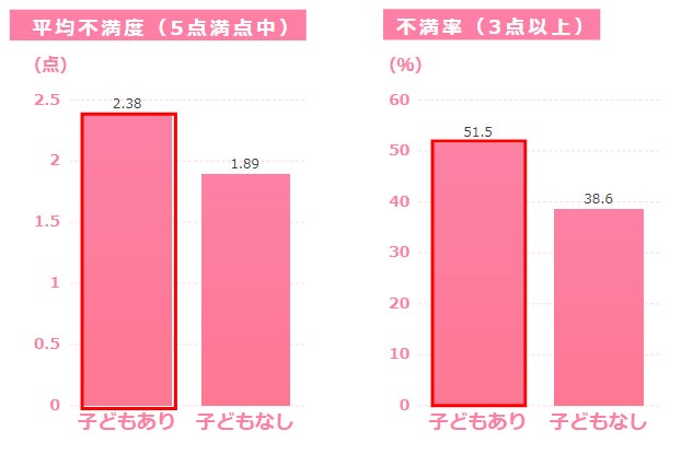 子どものいる人の平均不満度が2.38点、「不満3点以上」51.5%に対し、子どもがいない人は平均1.89点、「不満3点以上」38.6%と、育児期の負担が不満度を押し上げている可能性。