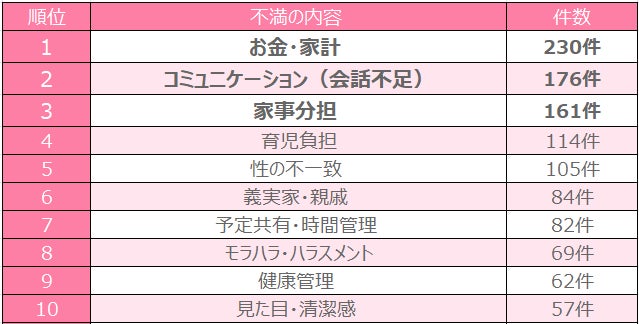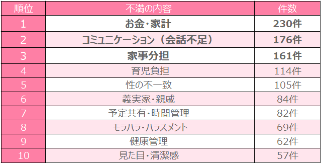 不満の内容トップ3は 1位:お金・家計(230件) 2位:コミュニケーション(176件) 3位:家事分担(161件) 以降、「育児負担(114件)」が続き、家計・会話・家事育児が三大不満に。