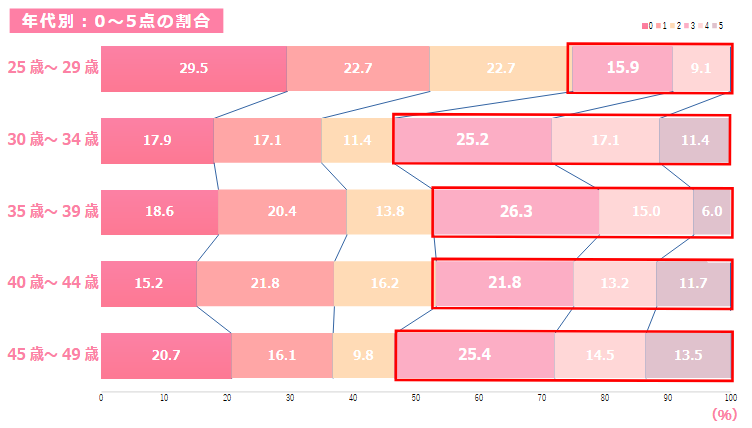 年代別では、25~29歳の不満3点以上は25.0%にとどまる一方、30~34歳で53.7%、45~49歳で53.4%と、30代以降で不満が一気に高まる傾向。