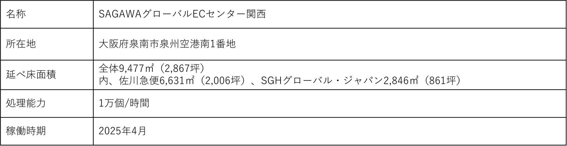 本センターは、佐川急便りんくう営業所が管轄するセンターの機能と、SGHグローバル・ジャパン株式会社(本社:東京都江東区、代表取締役社長:三古健二、以下「SGHグローバル・ジャパン」)の保税蔵置機能を併せ持ち、海外と日本を繋ぐゲートウェイのひとつとして2025年4月11日より稼働を開始しました。