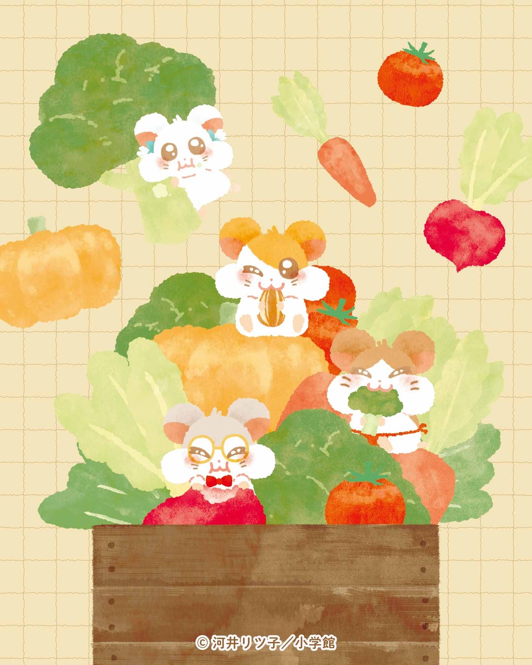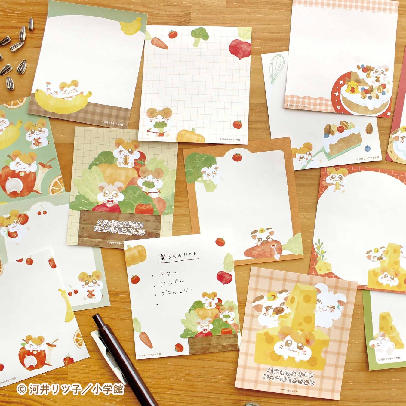 ハム太郎たちがフルーツや野菜、チーズやケーキを幸せそうに”もぐもぐ”食べる姿にほっこり癒される古川紙工描きおこしのデザインです!