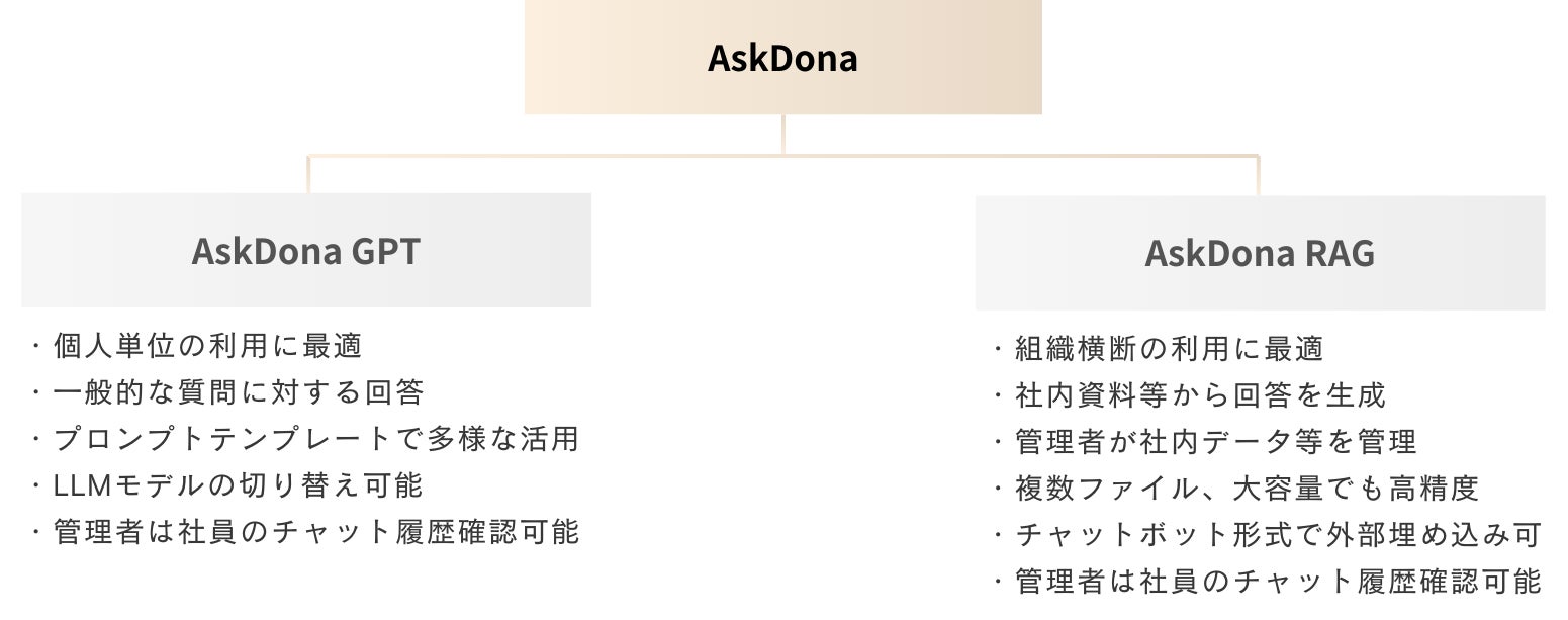 AskDonaは、「AskDona GPT」と「AskDona RAG」の2つのサービスで、企業の生成AI活用を支援します。