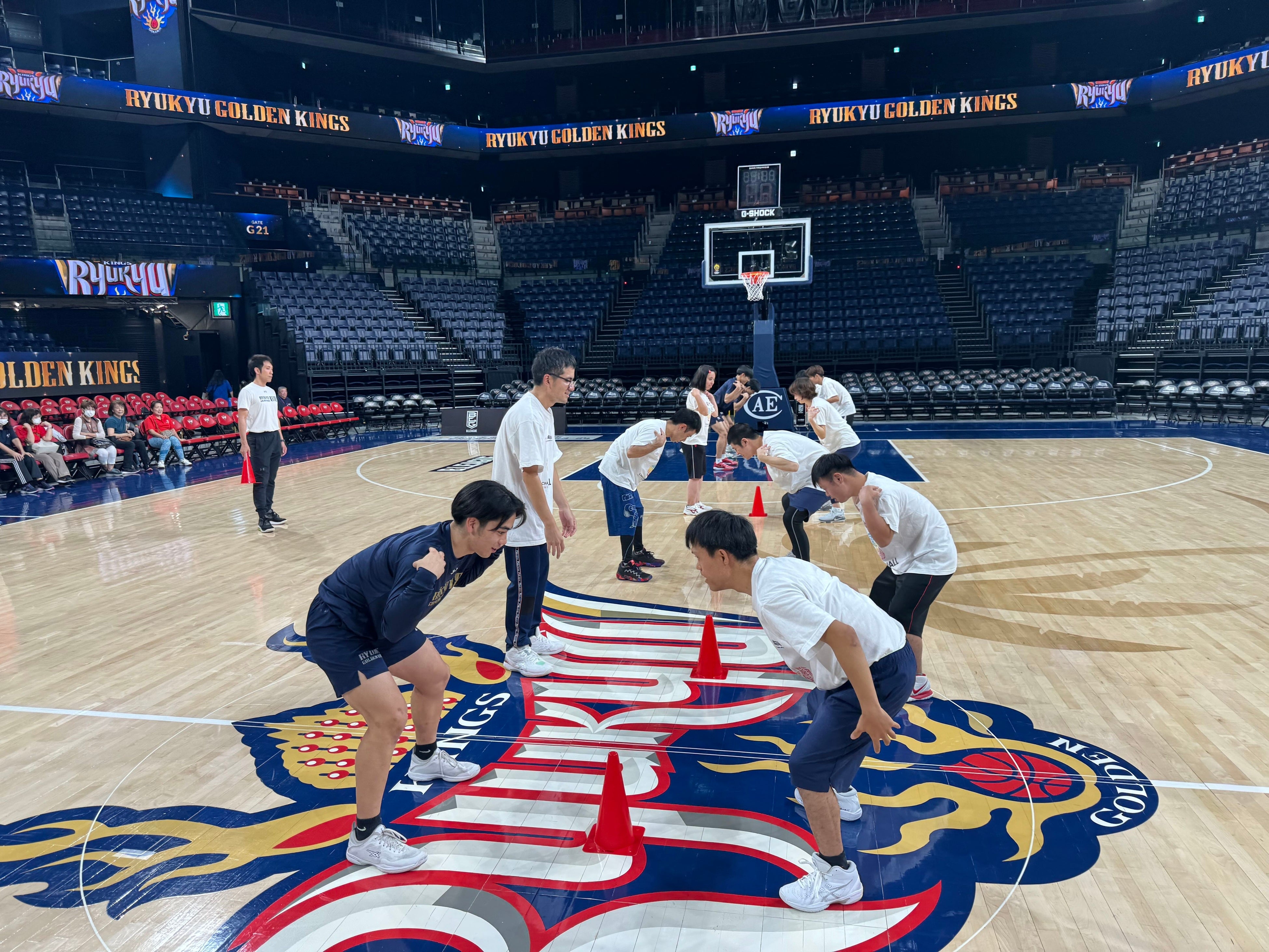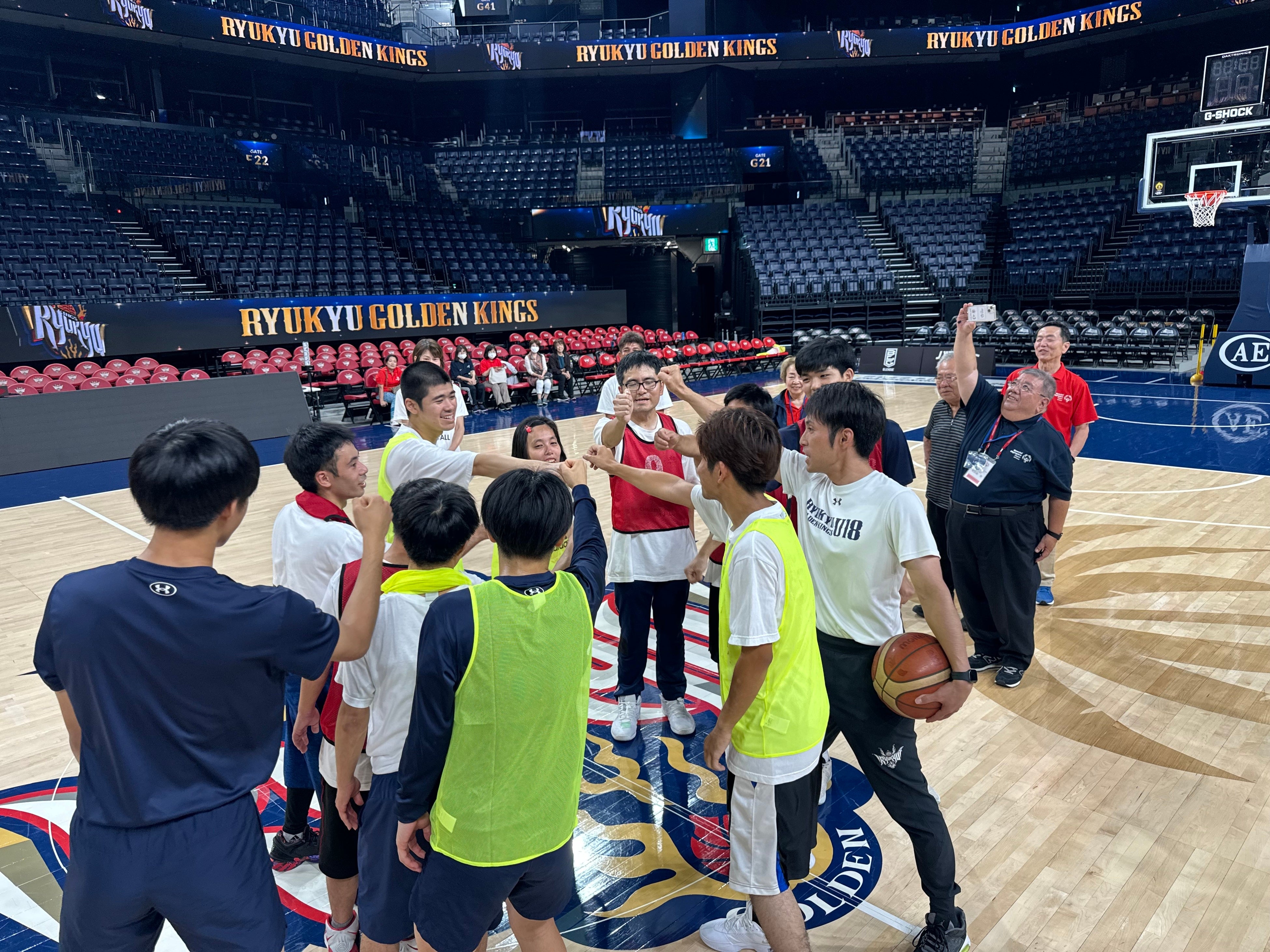 当日は、より本番である横浜アリーナに近い環境となる沖縄アリーナのメインコートを使用し、U18与那嶺コーチの指導の元、3名のキングスU18メンバーも参加し、基礎練習やU18選手とSON沖縄メンバーで編成したユニファイドスポーツ®︎バスケットボールゲームを実施し、本戦に向けた調整練習を行いました。