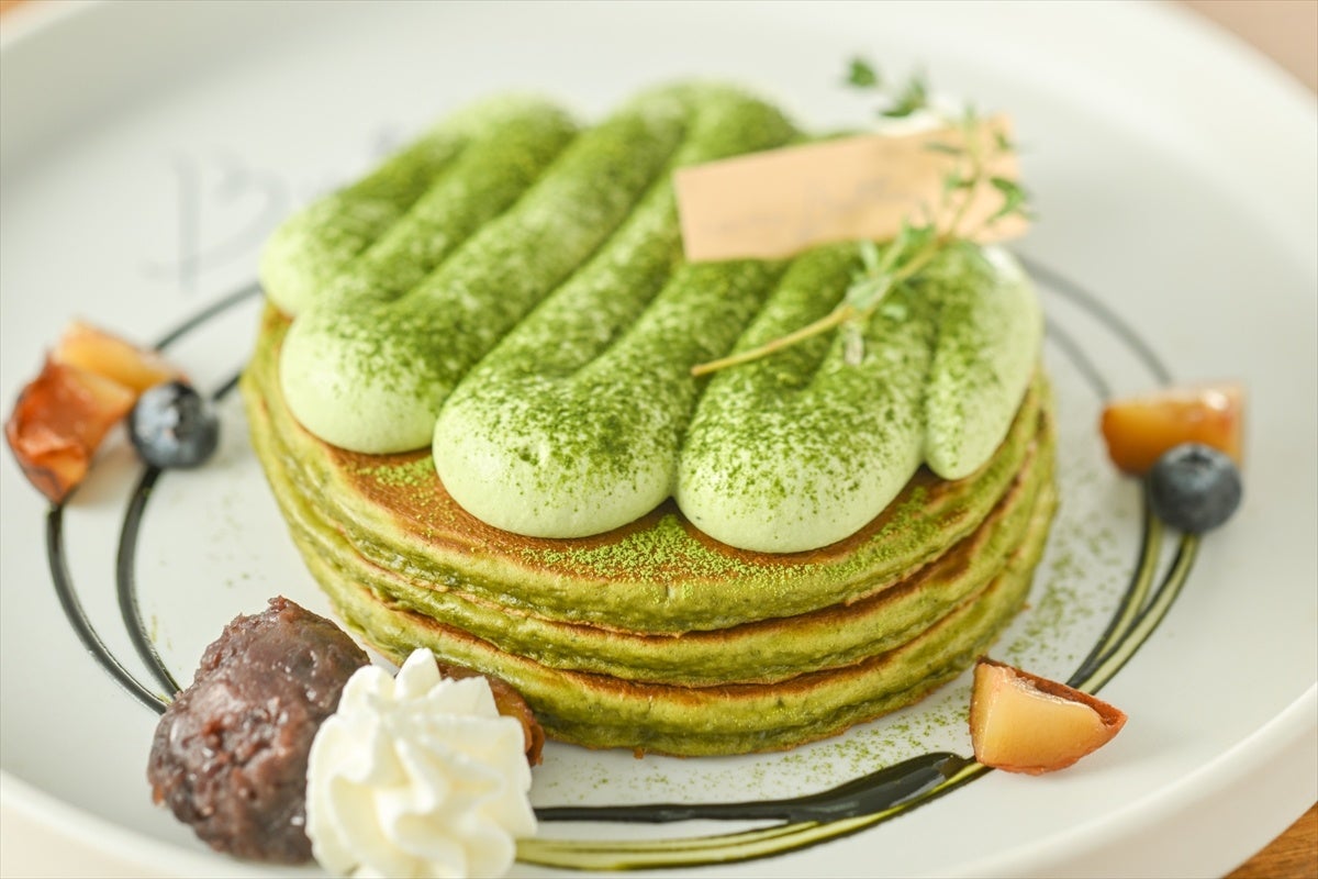 また、優しい甘さの『抹茶パンケーキ』も販売中です。生地にマスカルポーネチーズと西尾の抹茶を練りこみ、もちもち食感に焼き上げました。生クリームとマスカルポーネチーズ、西尾の抹茶をあわせたクリームをたっぷりと添えています。あんこや栗、生クリームなどで、味の変化もお楽しみください。こだわりの銅板でパンケーキを焼き上げる様子は、客席からもご覧いただくことができます。