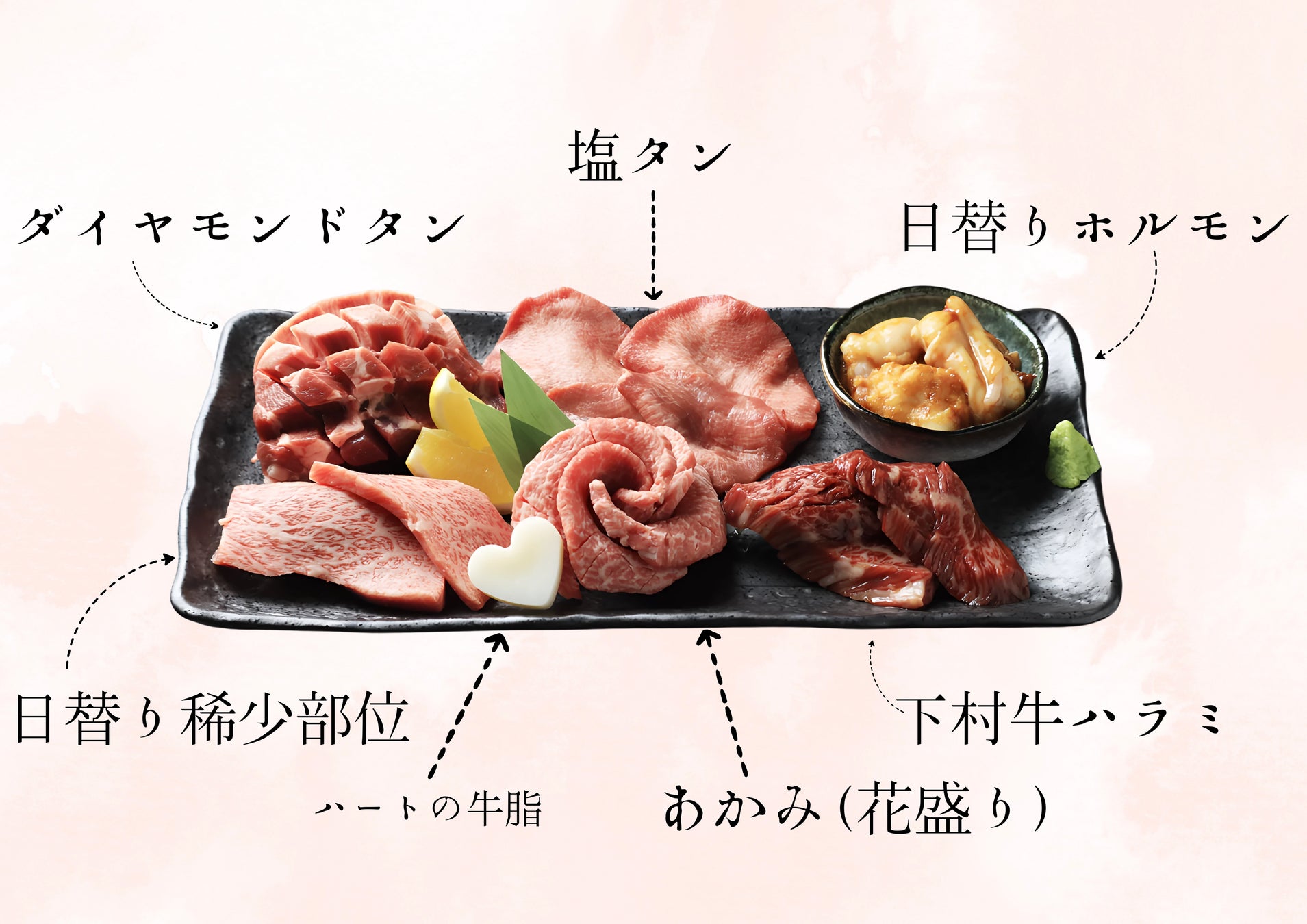 ダイヤモンドタン80g、塩タン60g、日替り稀少部位40g、あかみ60g、下村牛ハラミ40g、日替わりホルモン60g