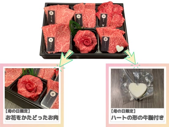 「お肉で作ったお花盛り」「ハート型牛脂」など、心ときめく演出でお母さんに笑顔を届けます。