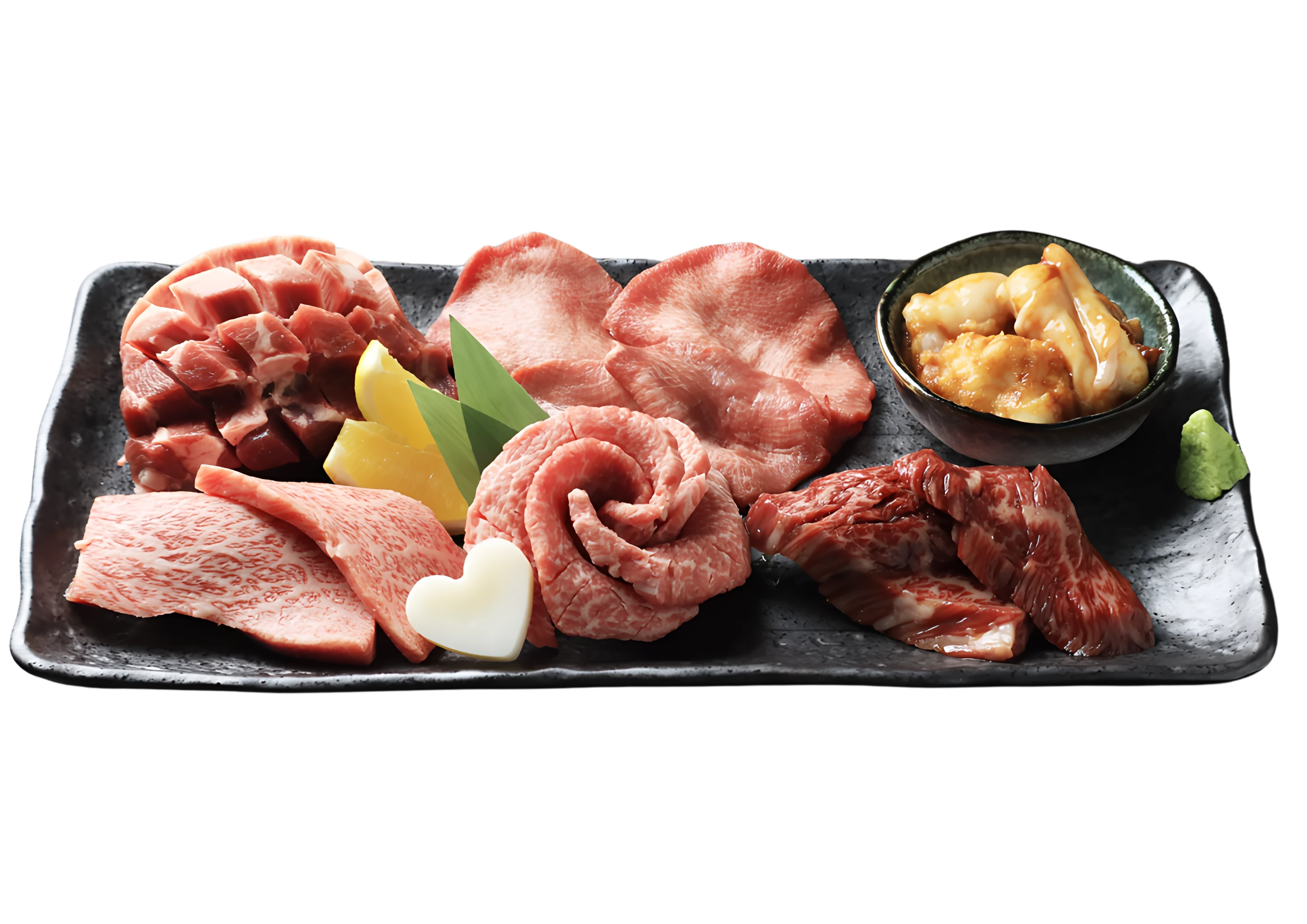 6種類の盛り合わせで、『下村牛』の魅力を余すところなく堪能いただけます。ダイヤモンドタン、塩タン、日替り稀少部位、お花を形どったあかみ、日替りホルモン、さらに日頃から「数量限定」販売している下村牛ハラミを一皿に盛り合わせ、異なる食感と風味を織りなす贅沢なハーモニー。下村牛ならではの濃厚な旨みと柔らかな食感を、一口ごとに味わい尽くしてください。