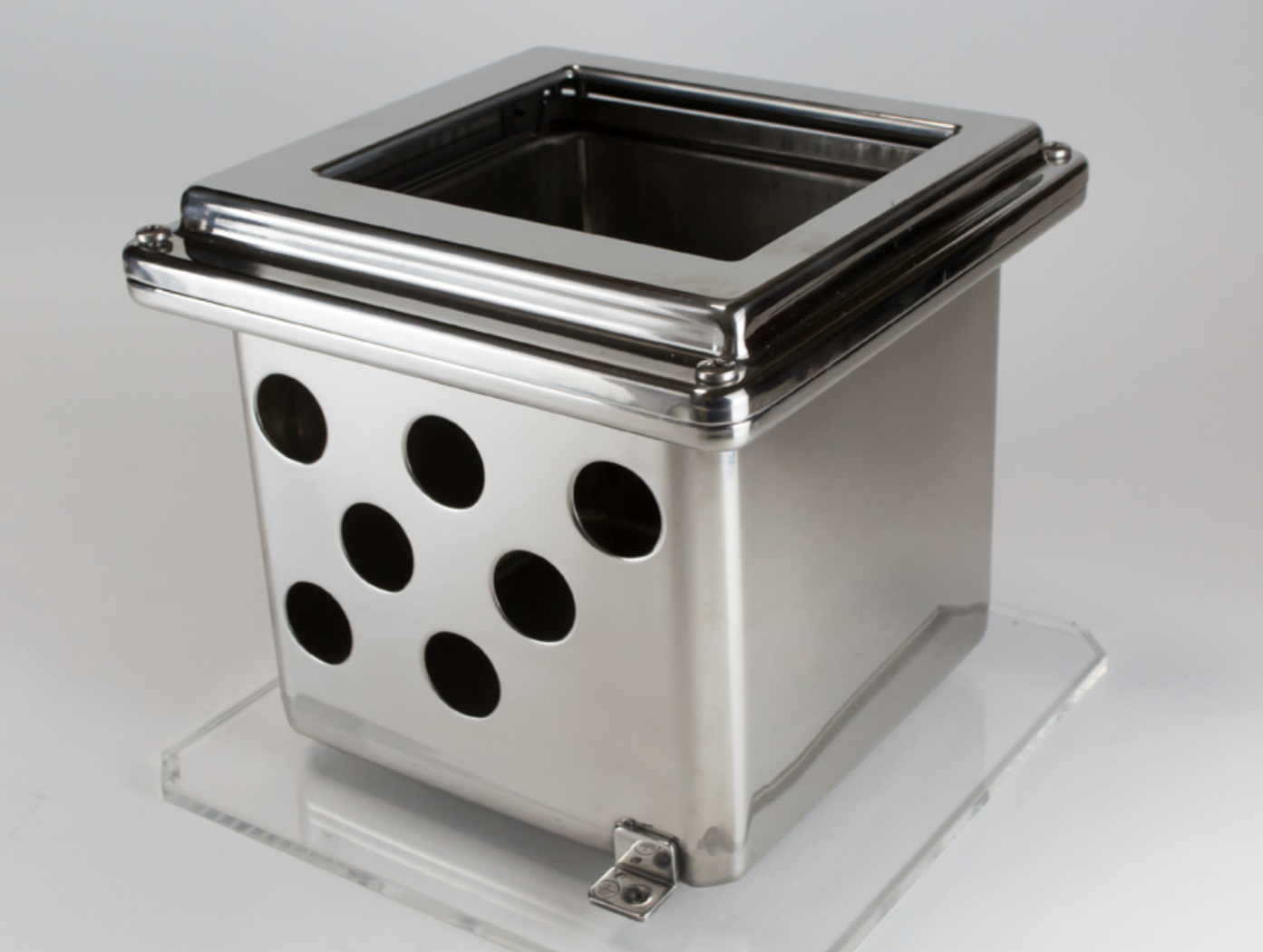 ステンレス板でできた、箱型の製品。縦と横は165㎜、深さは122㎜の大きさで、角がわずかに丸くなった八角形。これは一体、何なのだろう……と思ってしまうこの製品には、実は世界でもトップレベルといえる金属加工が施されています。