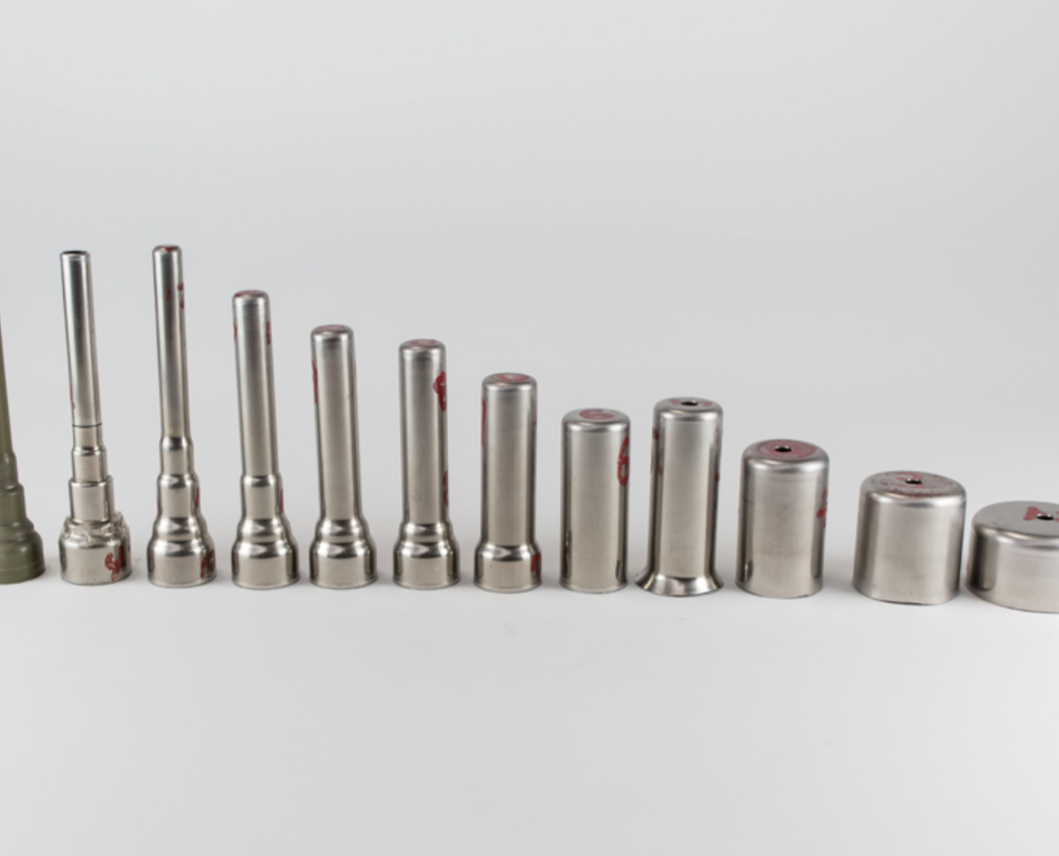 細く長く絞っていく加工には何度もプレスを繰り返す必要があります。下の写真は、右から左へと順に、深絞り加工を行っていった様子です。