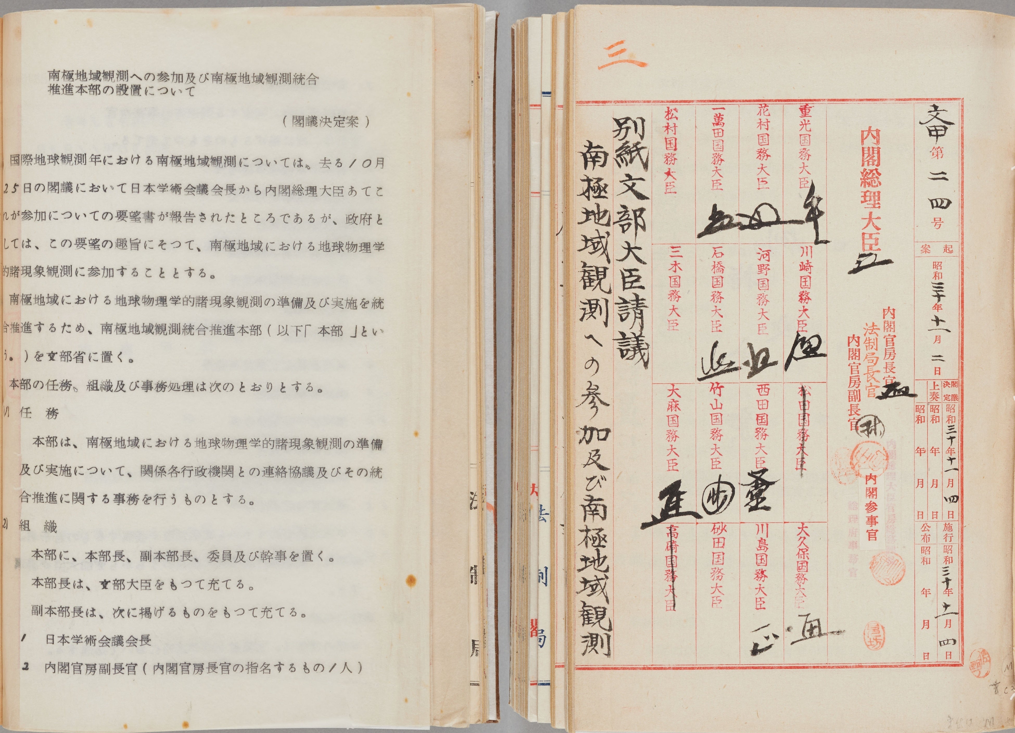 日本が再び南極を目指すことになるのは、終戦後の昭和30年(1955)のことでした。同年11月4日、政府は1957~1958年に行われる国際地球観測年に参加し、南極観測を行うことを閣議決定します。翌昭和31年11月には南極観測船「宗谷」が日本を出発し、昭和32年1月に観測隊が東オングル島に上陸。昭和基地を建設し、越冬を実現しました。