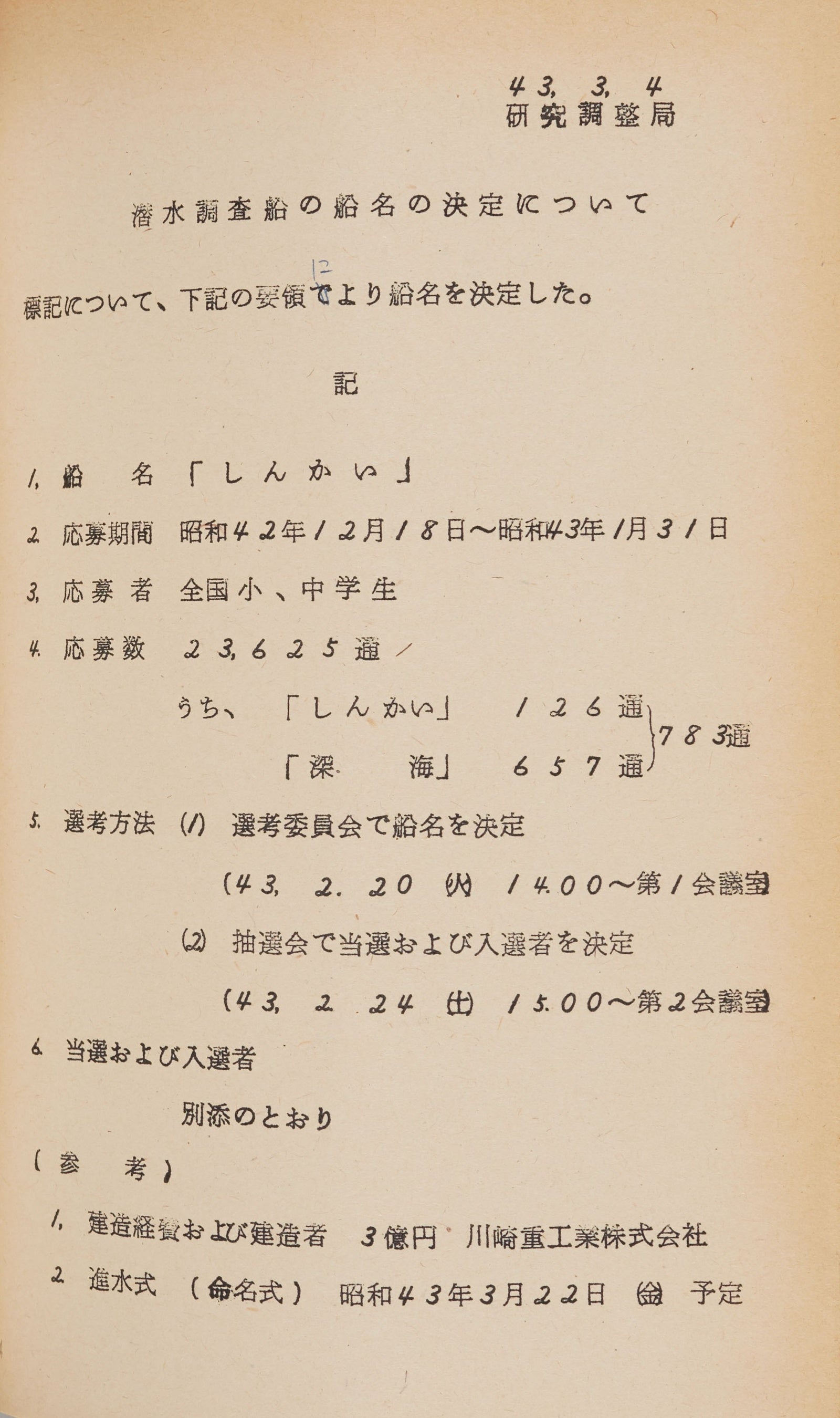 第二次世界大戦後、海洋石油資源の探索がはじまり、各国で海洋開発が本格的に行われるようになりました。日本でも海洋資源活用の機運が高まりましたが、当時の海洋科学技術は諸外国に比べ立ち遅れている状況にありました。この事態を打開するため、昭和36年(1961)に海洋科学技術審議会が設けられました。同審議会は、海洋科学技術推進の基本方針、当面の必要な措置、具体的な調査研究項目などを答申。これに基づき技術開発が進められました。特に深海の観測調査の分野では、他の潜水技術の開発とともに、潜水調査船の開発が提言されたことから、昭和42年から水深600mまで潜航可能な潜水調査船の建造が開始されました。翌昭和43年に完成したその船は、「しんかい」と名付けられ、日本の本格的な深海調査の幕開けを飾りました。