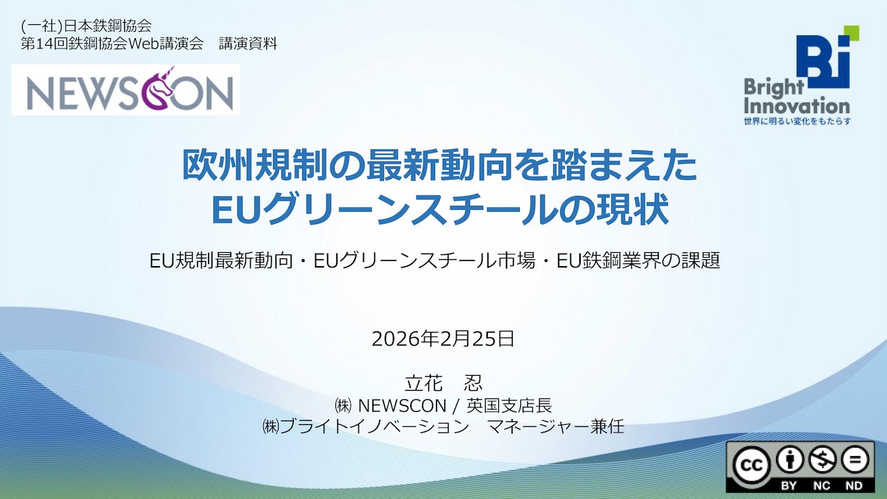 株式会社NEWSCONイギリス支店長の立花忍が、一般社団法人日本鉄鋼協会主催のWeb講演会に登壇し、欧州の環境規制とグリーンスチールの最前線について解説しました。過去最多規模となる多数の参加登録をいただき、業界の脱炭素化に向けた関心の高さが浮き彫りとなりました。
