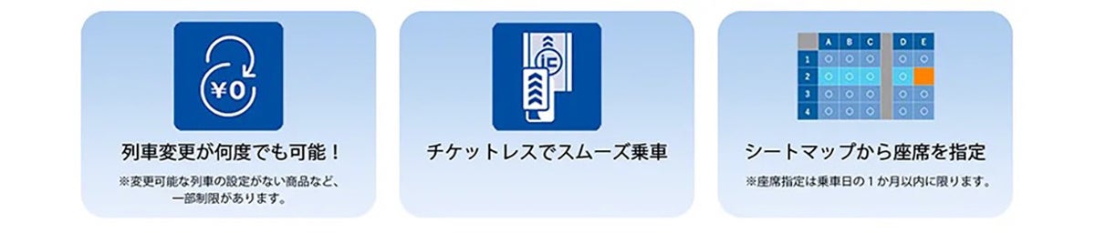 ・新幹線改札⼝を通る前で列⾞出発時刻前なら同⽇の列⾞変更が無料で何度でも可能(※)!