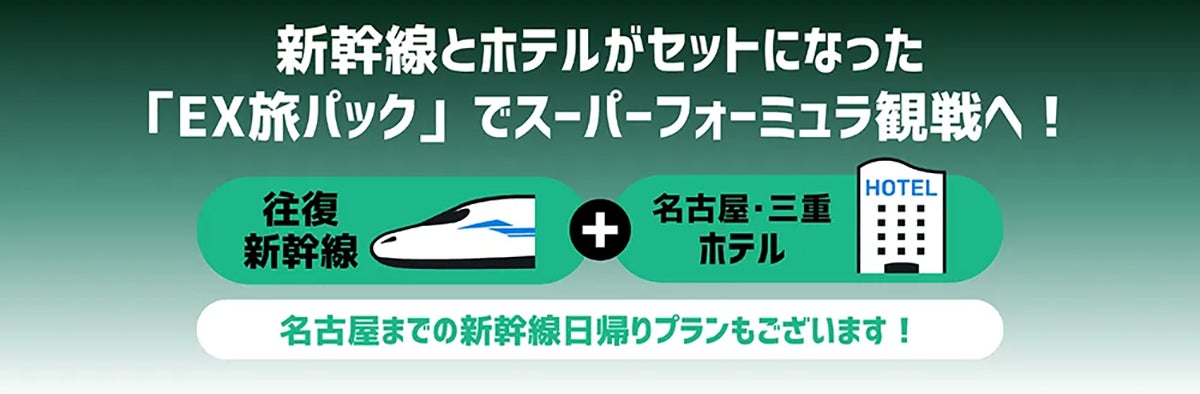 3⽉8⽇(⼟)・9 ⽇(⽇)に鈴⿅サーキットで開幕するSUPER FORMULAに向けて、⾸都圏エリア、東海(静岡)エリア、近畿エリアを発着とする名古屋駅までの新幹線と、名古屋・三重(桑名/四⽇市/鈴⿅/津)エリアでの宿泊とするホテルがセットで購⼊できる便利なプランとなっており、あとはSUPER FORMULA観戦チケットを⼊⼿するだけ!詳しくはJR東海ツアーズ「EX旅パック」の公式特設ホームページをご覧ください。