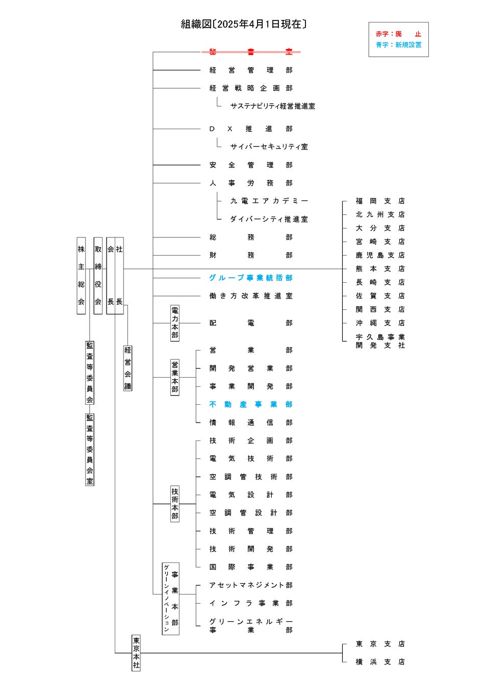 弊社は、2025年4月1日付で、「グループ事業統括部」および「不動産事業部」を新設し、「秘書室」を廃止 することを決定致しましたので、以下の通りお知らせします。