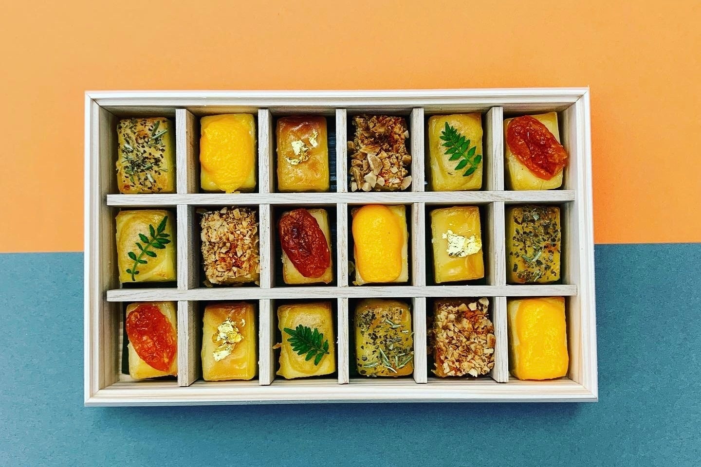 創業40周年を迎える大分の折詰専門店〈京屋本店〉は、クルーズトレイン「ななつ星in九州」の列車内料理も手がける名店。厳選したフランス産のクリームチーズを自家製の西京味噌床に長期間漬け込み熟成させ、自社農場「京屋の森」で採れた産物をトッピングした「クリームチーズ西京焼」は、料理人が一つひとつ丁寧に焼き上げた至極の逸品です。ワインはもちろん、辛口の日本酒、スパークリングにもよく合う最高級の酒肴をお楽しみください。
