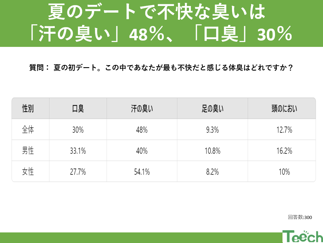 今回は、10代から30代の男女を対象に「夏の初デートで最も不快に感じる体臭」についてアンケートを実施しました。この結果を基に、夏のデートで体臭を防ぐための参考になるアドバイスをお届けします。