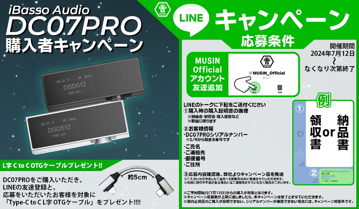 株式会社MUSIN公式LINEアカウントを友だち登録いただき、応募条件を満たしたお客様に、DC07PROのご利用にもぴったりな「L字 C to C OTGケーブル」をプレゼントいたします。