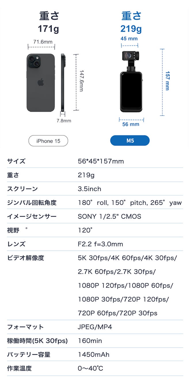 1/2.5インチセンサーを搭載したM5は、30fpsで5Kの鮮明さを実現し、移動中でもスムーズな映像を保証します。山を登るときでも、街の通りを進むときでも、映像は安定しています。