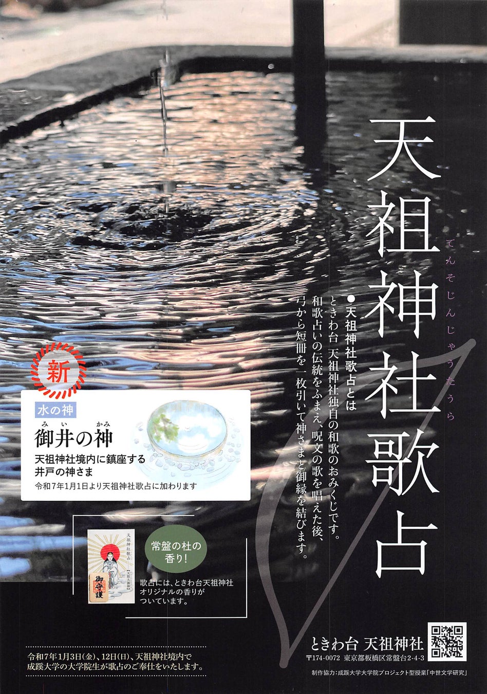 成蹊大学(学長:森雄一)文学部日本文学科 平野多恵教授と天祖神社(東京都板橋区南常盤台、宮司:小林美香)は、同神社のオリジナル和歌みくじを共同制作しており新たな神様の歌占が加わることになりました。