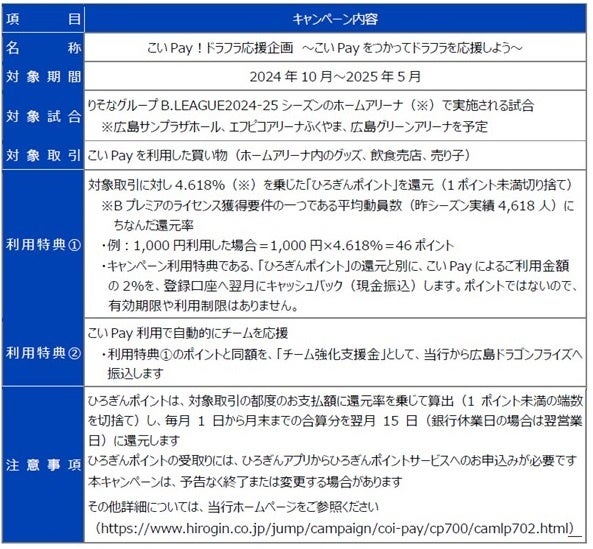 株式会社広島銀行(頭取 清宗 一男、以下「当行」)では、地域の更なる盛り上がり醸成ならびに地元スポーツチームの活動を応援するため、B.LEAGUE2024-25シーズンにおける広島ドラゴンフライズのホームゲーム会場にて、こいPay取引を対象としたキャンペーンを実施しますので、下記のとおりお知らせいたします。