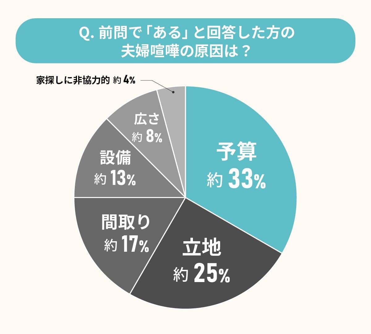 夫婦喧嘩の原因として多かったものが「予算関連」の約33%でした。次いで「立地やエリア」が約25%。残りが家の「設備」や「間取り」、「広さ」に関するのものでした。