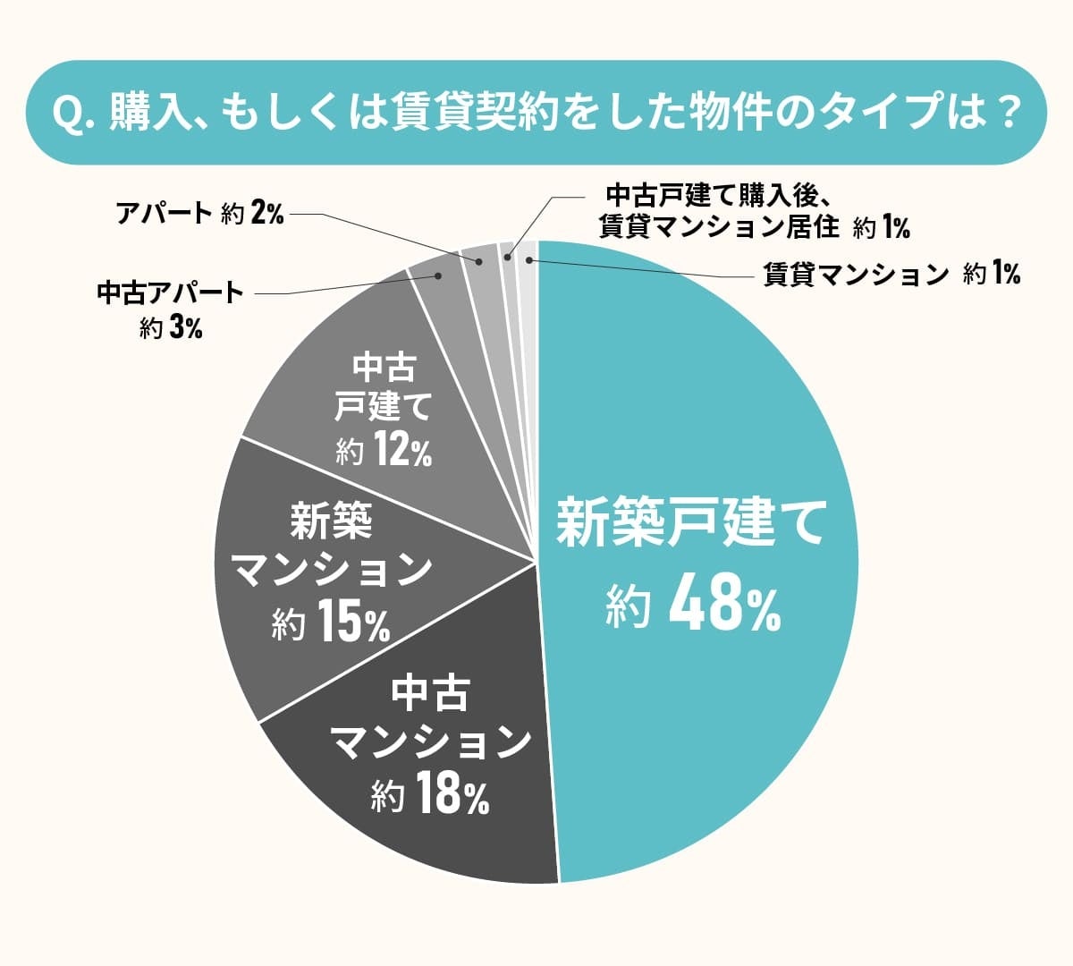 一番多かった回答は「新築戸建て」の約48%。続いて大きなボリュームゾーンとして中古マンションの約18%、新築マンションの約15%、中古戸建ての約12%となっています。