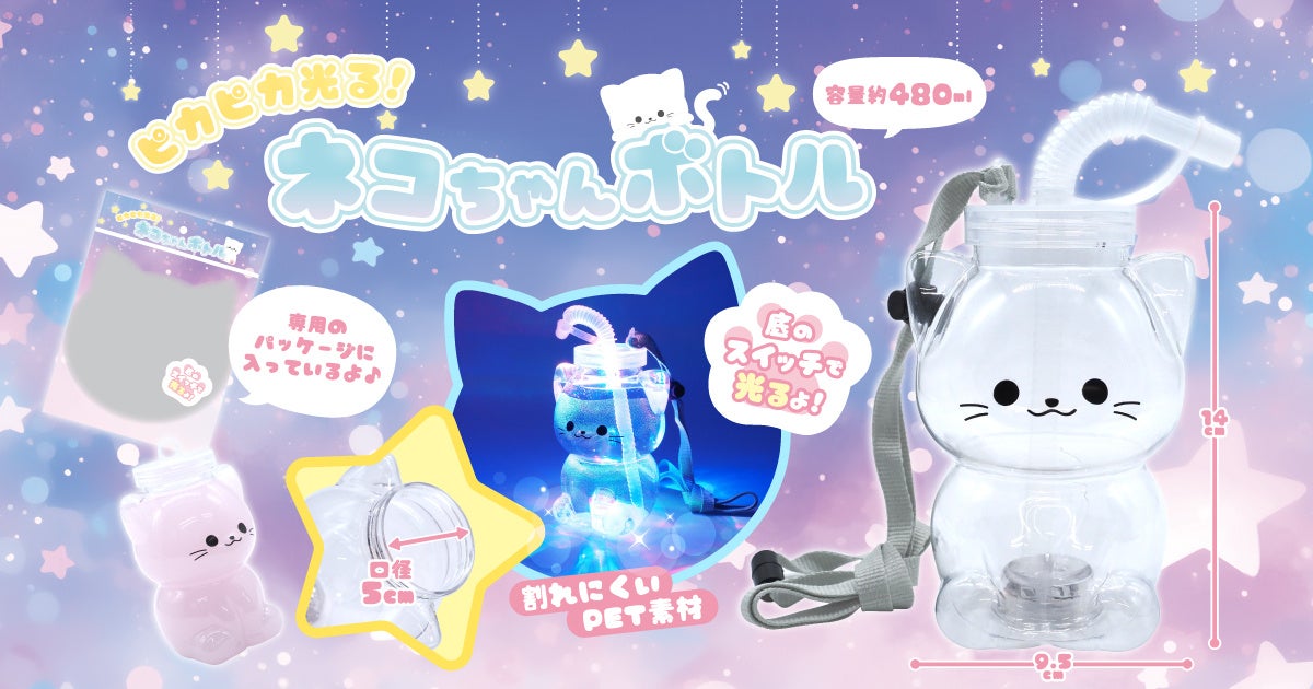 縁日やイベント・アミューズメントにオススメの「ピカピカ光る!ネコちゃんボトル」好きな飲み物を入れて、楽しいイベントをもっと盛り上げちゃおう!