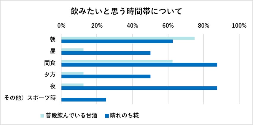 『晴れのち糀』はアレンジの豊富さで、普段飲んでいる甘酒と比較して、飲みたいと思う時間帯が多いことが分かりました。特に昼、夜や運動時など、甘酒をあまり欲しない時にも飲みたいと考える人が多く、どんな時間帯でも飲みたくなる商品といえます。