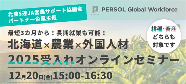 パーソルグループで外国人材に特化した人材サービスを提供するPERSOL Global Workforce(パーソル グローバルワークフォース)株式会社(本社:東京都港区、代表取締役社長:多田 盛弘)は、12月20日(金)に、北海道の農業(耕種・畜産)事業者を対象とする、外国人材採用に関するのオンラインセミナーを開催します。セミナーでは、外国人材の受け入れに関する基礎情報から、いま北海道で活躍している人材の事例、インドネシア現地の農業学校の授業の様子などを公開します。なお、本セミナーは、北農5連JA営農サポート協議会(JA北海道中央会、ホクレンなど)、北海道が後援します。