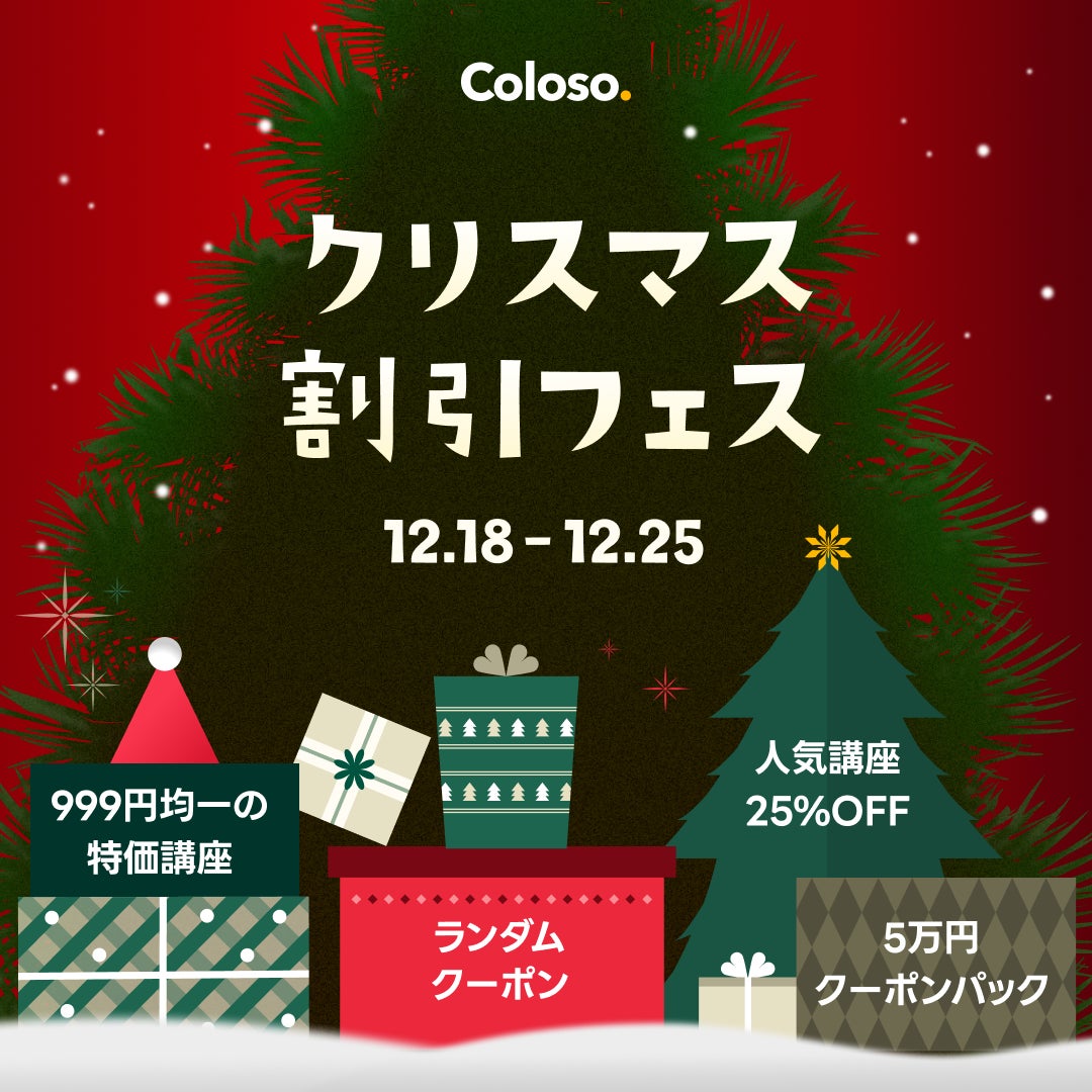 999円均一の超特価講座をはじめ、毎日11時に先着100名様限定に最大30%OFFのランダムクーポンから、Colosoトップの人気講座25%割引まで、多様なクリスマスプレゼントをご用意しました。