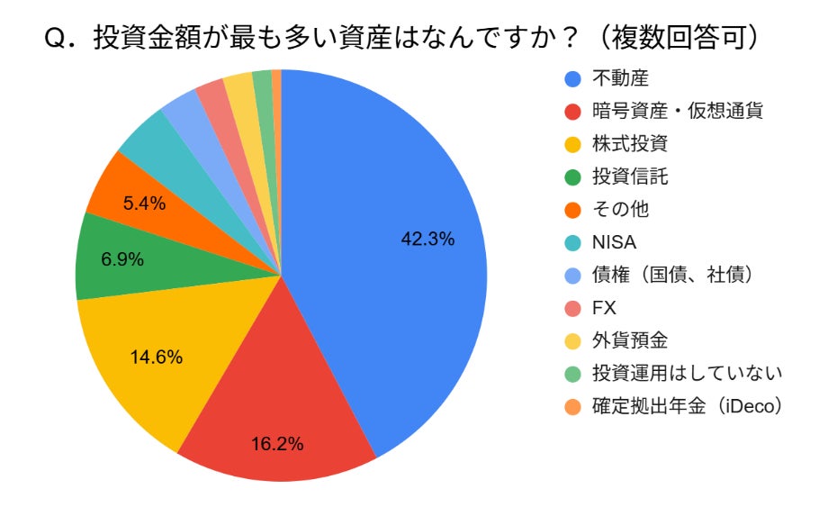 投資金額が最も多いのは、海外を含む「不動産」が総回答数の42.3%と半数近い割合になった一方で、現在の投資先では暗号資産・仮想通貨、不動産、株式投資、NISA、投資信託がそれぞれ10%以上の割合となった