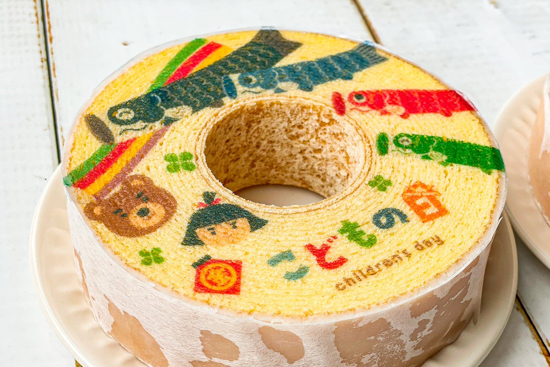千葉県産米粉を100%使用した、しっとりもっちり食感が大人気のグルテンフリーバウムクーヘン。職人が丁寧に焼き上げたバウムクーヘンの表面には、まるで絵本のように色鮮やかなこどもの日モチーフがプリントされています。