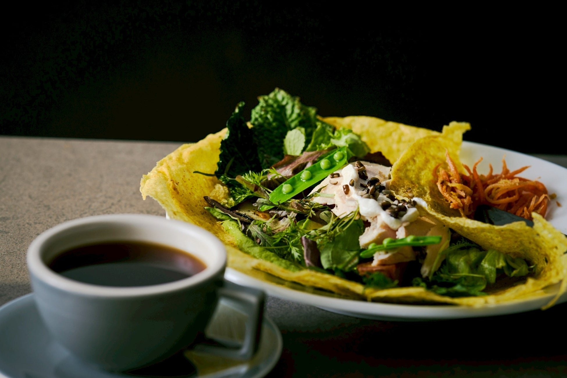 コーヒーと一緒に楽しめる野菜たっぷりの米粉のクレープ、鶏粥の2種類から選べるモーニングから始まり、ランチからカフェ、ディナータイム、バーのシーンの境界を曖昧にしながら、日常をゆるやかにつなぎます。さらに、BASE LAYER HOTELの特徴の一つでもあるサウナ後に「整う」メニューとして、野菜や果物、ハーブ、米粉の麺を使ったヘルシーな料理や辛いもの、植物由来を選べるドリンクなども揃います。お酒もBASE LAYER HOTEL × Hobo Brewing × MAISON YWEのトリプルコラボクラフトビール、KIKI WINE CLUBがセレクトしたナチュラルワイン、国産ウイスキーや焼酎、国内外のジン、バーカクテルなど各種ラインナップ。