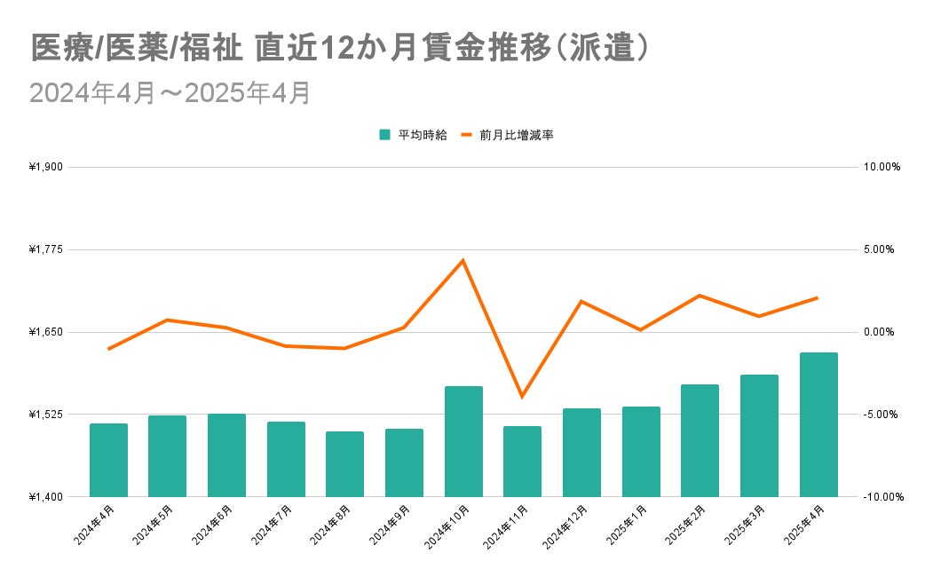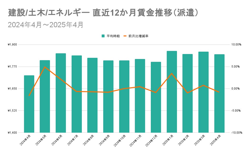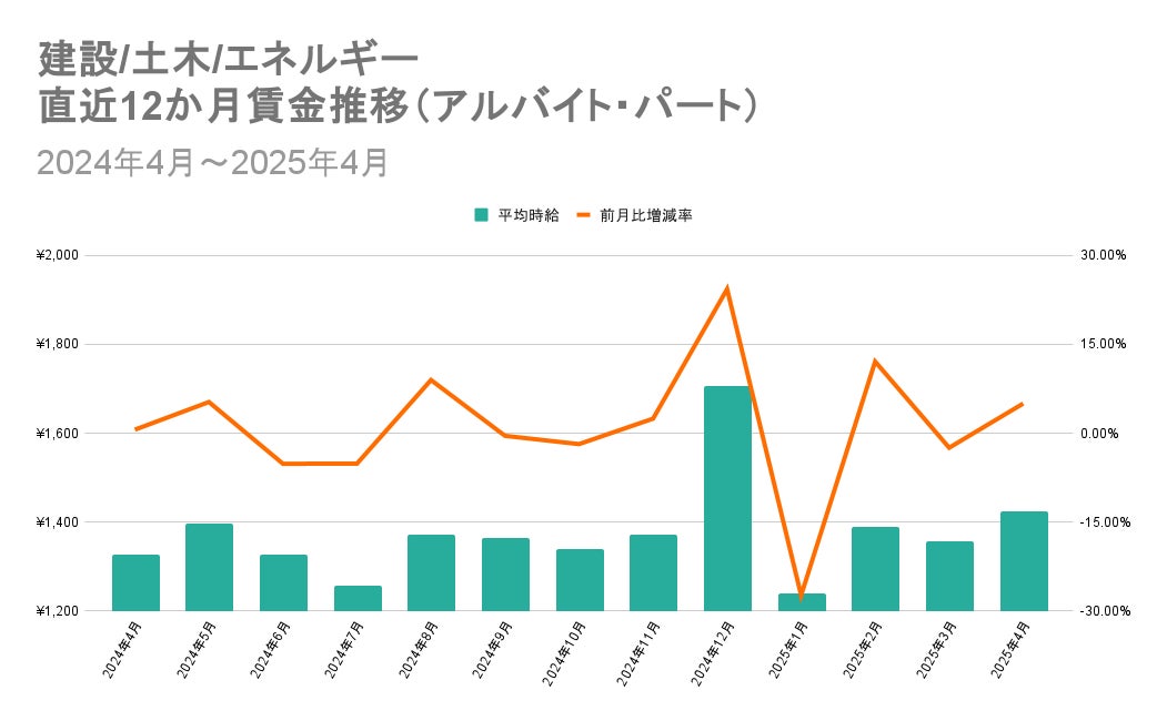 1位の「医療/医薬/福祉」と11位の「建設/土木/エネルギー」における直近12か月の賃金推移を比較すると、「医療/医薬/福祉」は2024年10月に特定の派遣会社が高時給求人を複数出稿した影響で平均時給が増加。同求人の掲載終了が影響し2024年10月から11月にかけて平均時給が減少したあとは上昇傾向に入り、2025年3月度につづき2ヵ月連続で1位となっています。