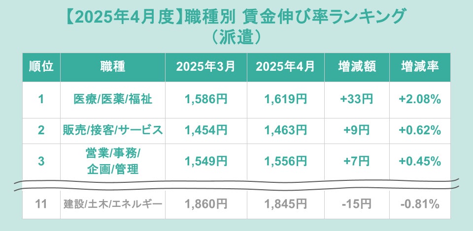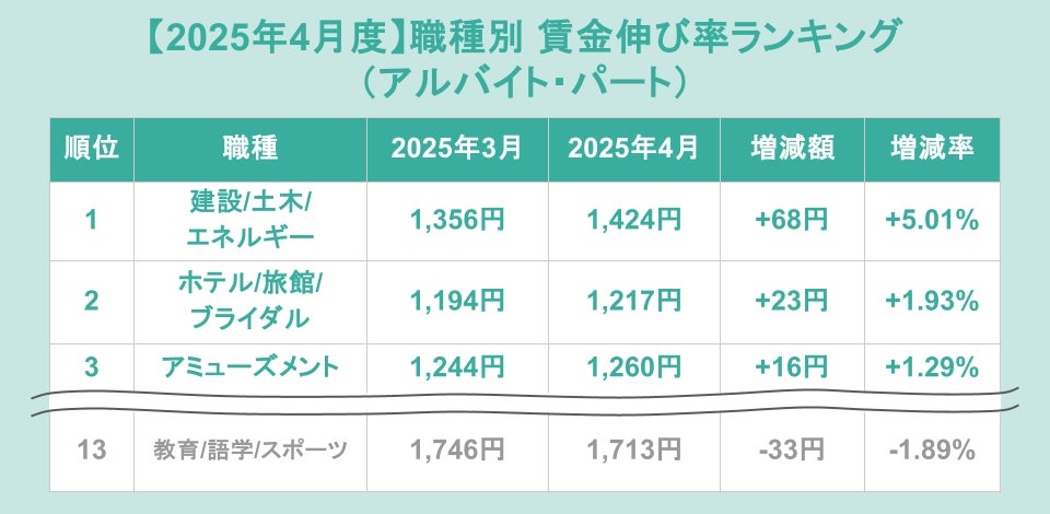 求人サイト主要9媒体から雇用形態別に分析!アルバイト・パートでは建設系が前月比+5.01%で1位【2025年4月度 職種別 賃金伸び率ランキング】