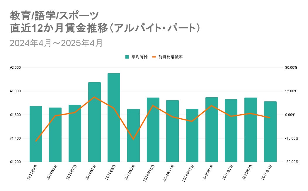 1位の「建設/土木/エネルギー」と13位の「教育/語学/スポーツ」における直近12か月の賃金推移を比較すると、「建設/土木/エネルギー」は2024年12月に複数の企業が集中的に出稿した影響で、2024年11月から12月にかけて平均賃金が大幅に上昇し、翌2025年1月には大きく減少しました。
