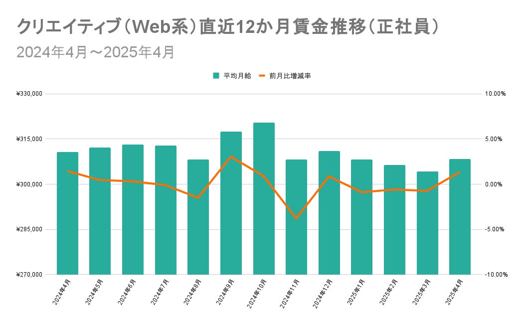 ワースト1は「クリエイティブ(Web以外)」(減少額-821円、減少率-0.28%)でした。正社員では全体的に平均賃金の増加が見られ、前月比で減少となったのは「クリエイティブ(Web以外)」のみとなりました。