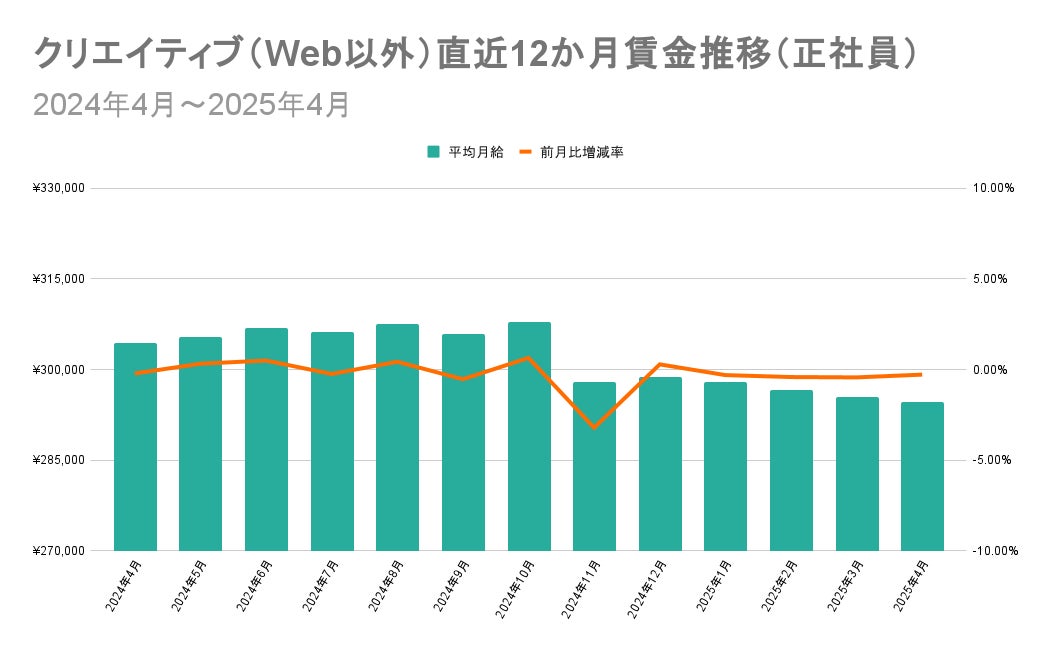 「クリエイティブ(Web以外)」では、複数の企業が月給25万円未満の求人を相次いで出稿した影響で、2024年11月を境に平均月給が30万円を下回りました。その後も緩やかな減少傾向が続いています。
