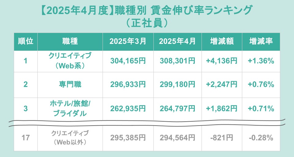 正社員の職種別賃金伸び率ランキング(前月比)トップ3は、1位が「クリエイティブ(Web系)」(増加額+4,136円、増加率+1.36%)、2位が「専門職」(増加額+2,247円、増加率+0.76%)、3位が「ホテル/旅館/ブライダル」(増加額+1,862円、増加率+0.71%)でした。