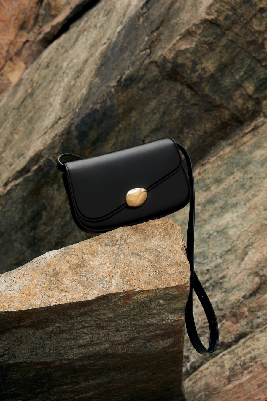 コレクションを象徴するディテールとして、フロントフラップは非対称性を持たせた斜めのカッティングを採用。玄武岩をモチーフにしたBasaltロック金具がポイントになっています。
