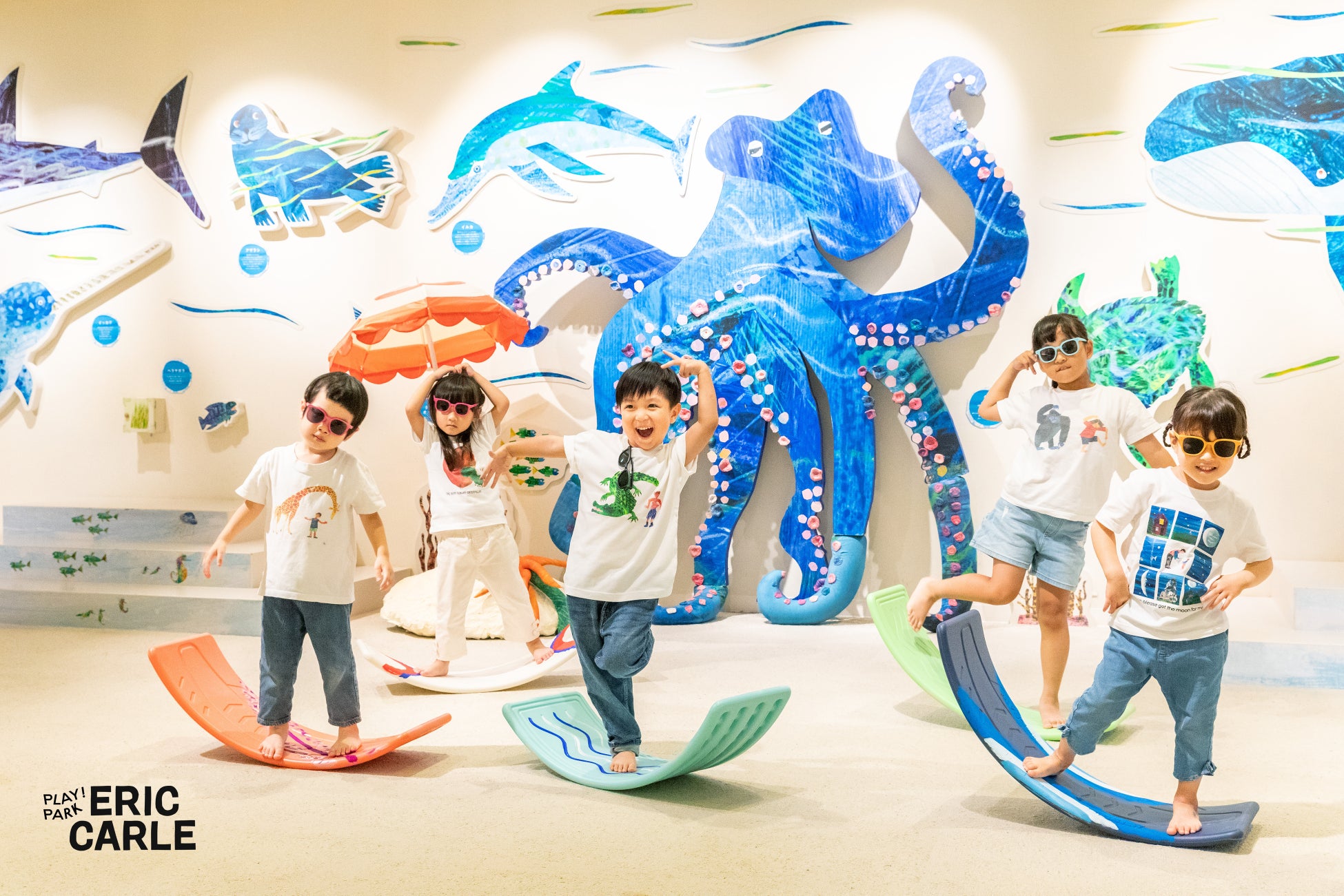 エリック・カールが描いた海のいきものが集まるディスカバリーゾーンで、サーフィンを楽しむように、ボードの上に立ったり座ったり、ゆらゆら揺らしながら様々なポーズに挑戦します。