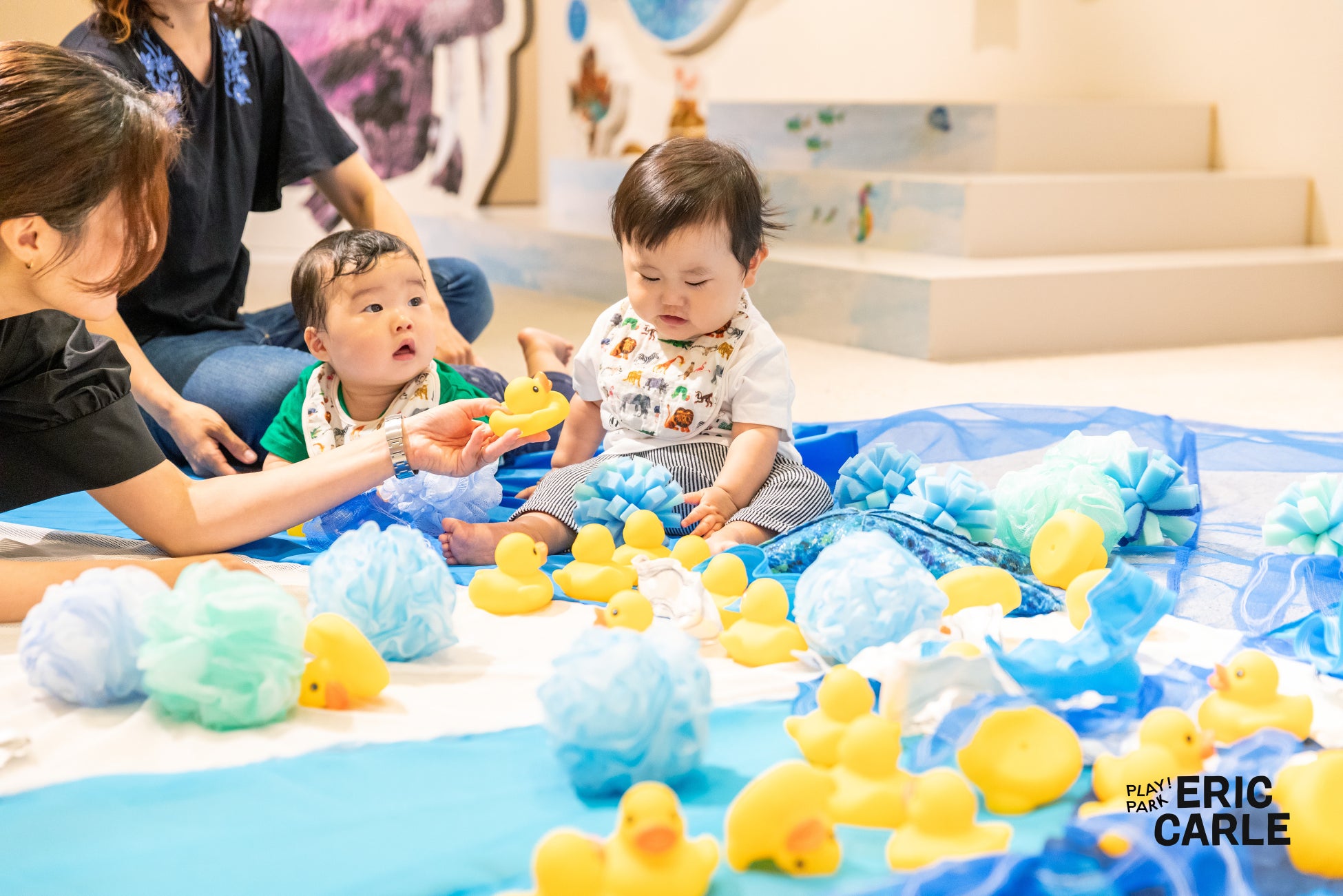 エリック・カール作絵本『10このちいさなおもちゃのあひる』のストーリーを体験するワークショップです。おもちゃのあひると一緒に、波に揺られて海の世界を楽しみます。嵐の場面では、ディスカバリーゾーンが少し暗くなり、シャボン玉が飛び出します。