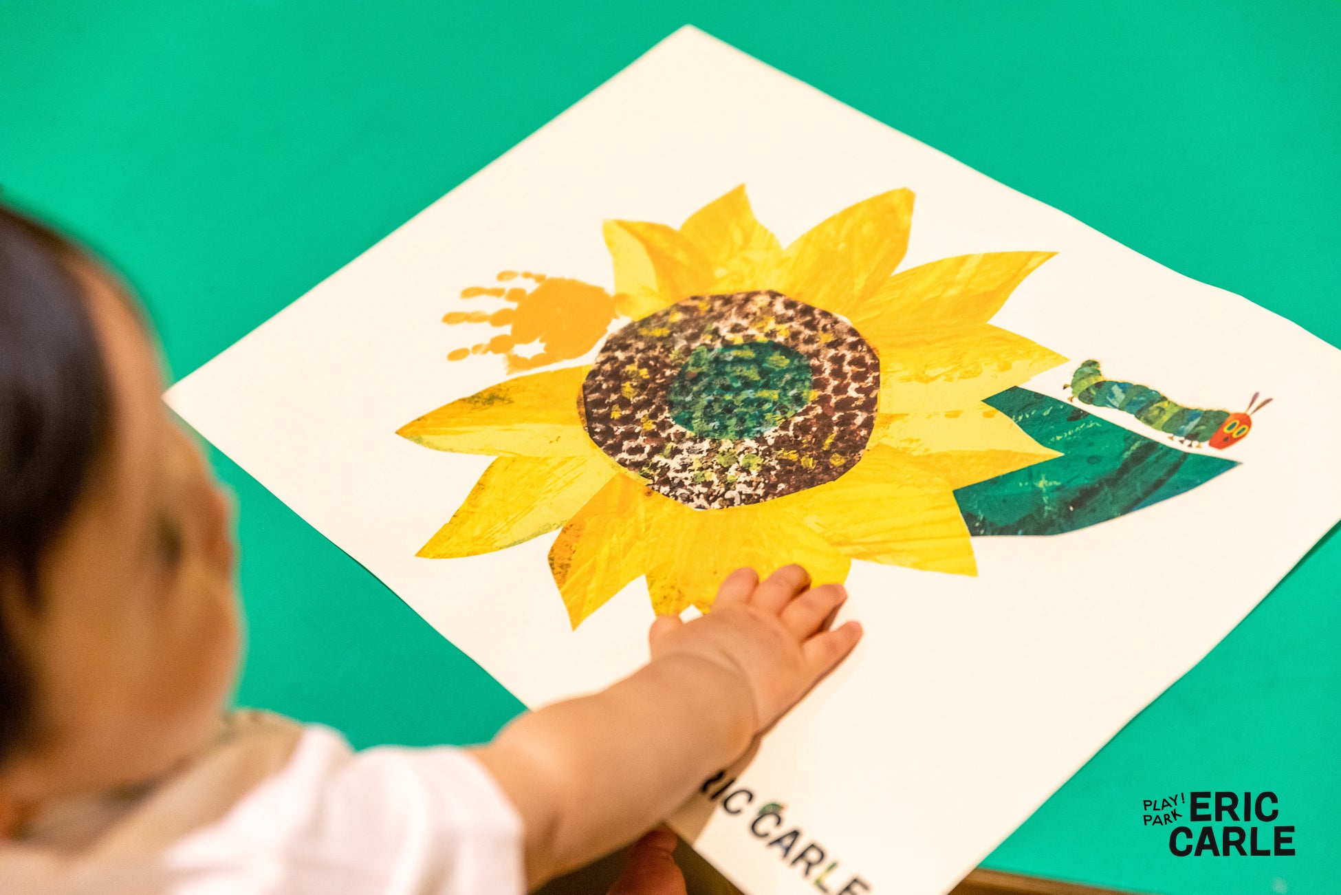 エリック・カールのイラストの一部に手形を押す、大人気のワークショップです。「はらぺこバカンス」期間中は、「ひまわり」のイラストで開催します。あっという間に大きくなってしまうお子さまの「今」を、思い出に残すことができます。