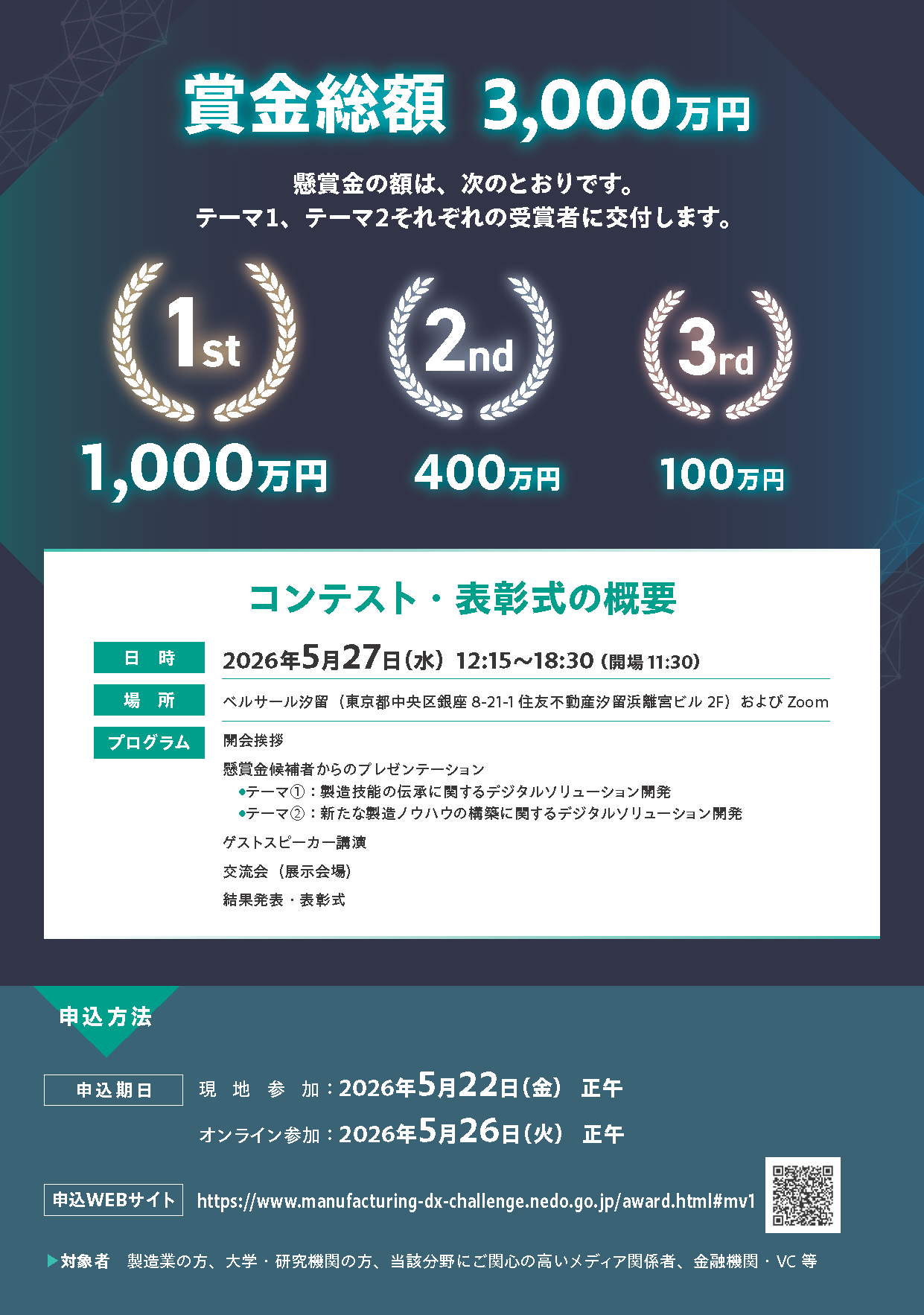 コンテスト・表彰式の概要、申込み方法などは、「NEDO Challenge, 製造業DX ~製造技能の伝承・新たな製造ノウハウの構築をデジタルで実現せよ~」専用HPをご確認ください。