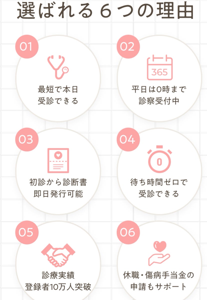 「メンクリ」はオンラインで気軽にこころの病を相談できるだけでなく、以下の6つの利便性を持ち合わせております。