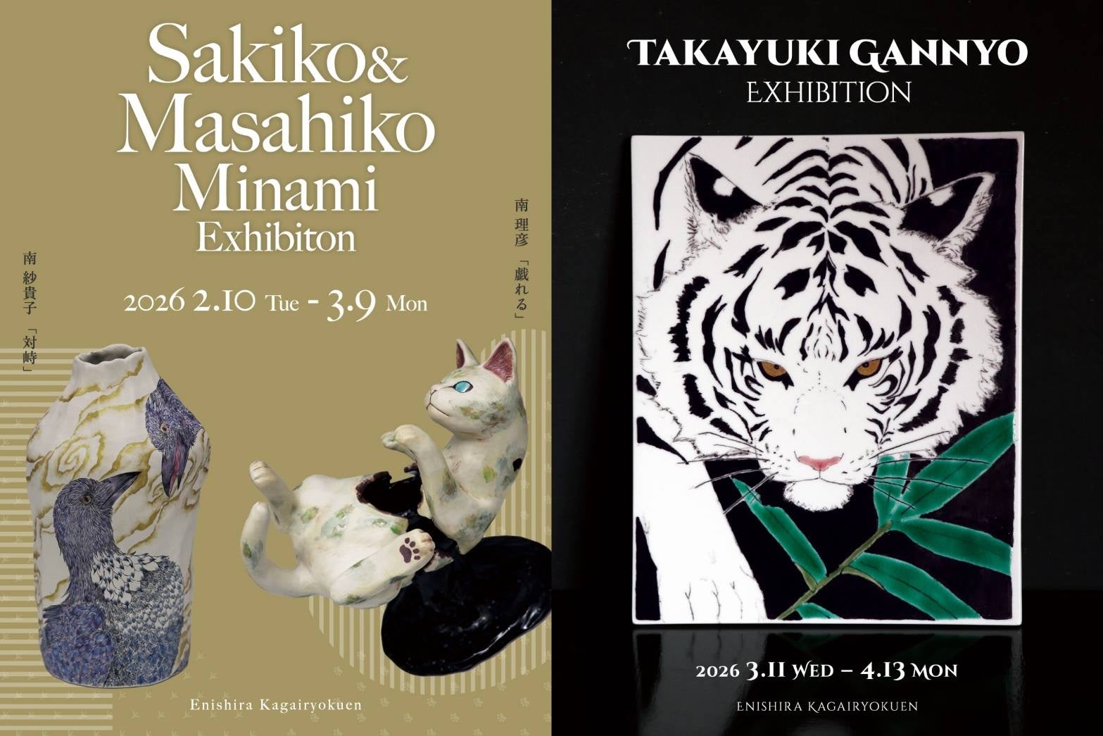 【加賀依緑園】猫・鳥・草の息づきを映す陶芸『南 紗貴子・理彦 二人展』(2026年2月10日~)/鬼百合と白き眷属を描く九谷焼『元女 貴之 展』(3月11日~)